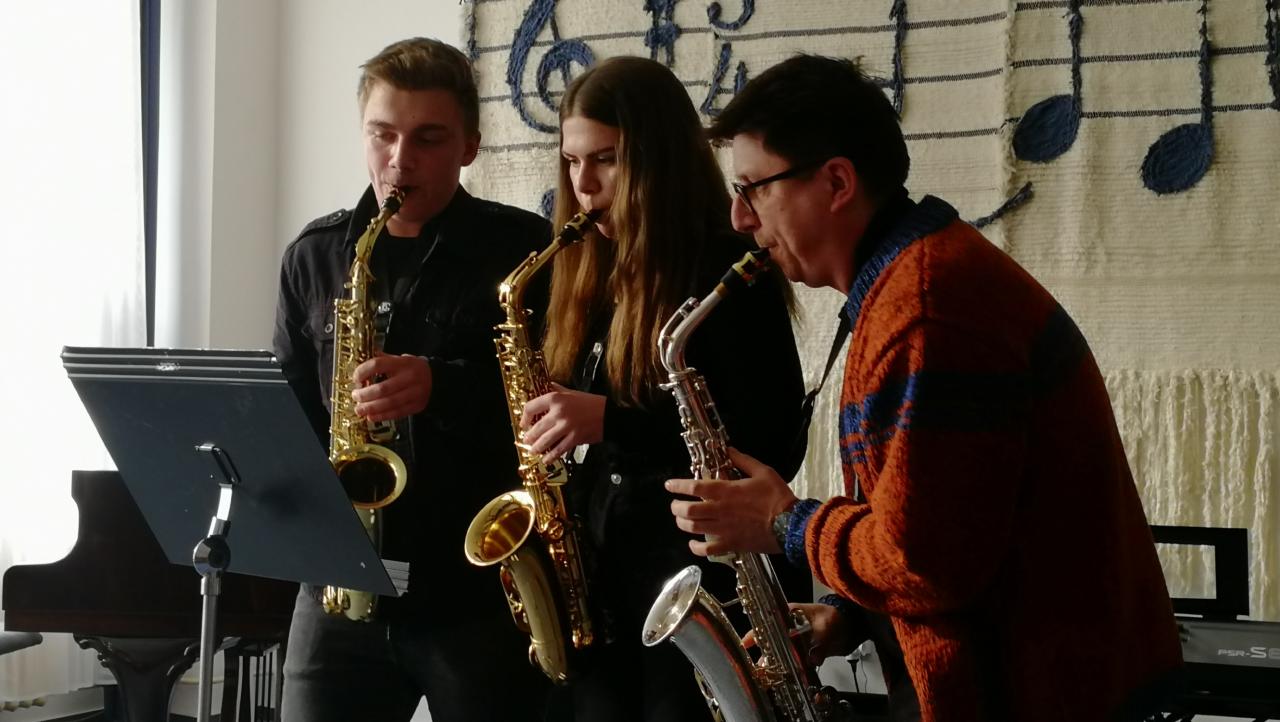 O. Soukup, K. Soukupová, pan učitel P. Hrubý, saxofonové trio